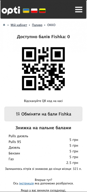 - QR-код - за допомогою даного коду можна розрахуватися балами Fishka на АЗС ОККО. ВАЖЛИВО: Для обміну балів на паливо потрібно вводити ПІН код який ви можете встановити за допомогою офіційного додаток Fishka.